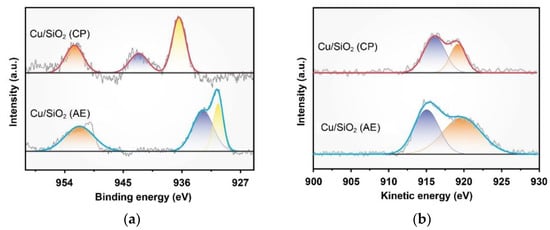 XPS spectra of the Cu/SiO2 catalysts are shown in Figure 5a. No peak at 940–945 eV is found for the Cu/SiO2 (AE) catalyst, indicating that Cu2+ is totally reduced to Cu+ or Cu0 [,,], and the two peaks with binding energies at ~932 eV and 952 eV are assigned to the 2P3/2 and 2P1/2 of Cu+ or Cu0 [,]. The Cu/SiO2 (CP) catalyst shows a peak at 940–945 eV related to Cu2+, indicating the incomplete reduction of CuO. This is consistent with the results of XRD and H2-TPR. The peak with binding energy at ~935 eV may be related to the 2P3/2 of Cu2+ [,]. The peak with binding energy at 952 eV is assigned to the 2P1/2 of Cu0 []. To further analyze the content of Cu+ and Cu0, the Cu LMM auger spectra is investigated (Figure 5b). For the Cu/SiO2 (CP) catalyst, the peak between 910–925 eV is divided into two peaks at 916 eV and 919 eV, which are ascribed to Cu+ and Cu0 species [,]. Accordingly, the Cu/SiO2 (AE) catalyst shows two peaks for Cu+ and Cu0 species at 915 eV and 920 eV, respectively []. For the Cu/SiO2 (AE) catalyst, the Cu+/(Cu0 + Cu+) intensity ratio, obtained by fitting the Cu LMM peaks, is 32%, higher than that of Cu/SiO2 (CP) catalyst (22%) (Table 1) [].