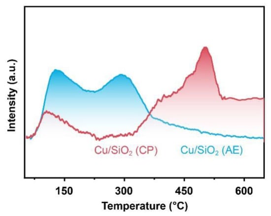 The NH3-TPD profiles of Cu/SiO2 catalysts are shown in Figure 6. For the Cu/SiO2 (CP) catalyst, the peaks at 90–240 °C and 330–530 °C are attributed to the desorption of NH3 at weak and strong acid sites. The acid amounts of weak acid and strong acid are 0.03 mmol∙g−1 and 0.12 mmol∙g−1, respectively. Additionally, the NH3 desorption peaks at 90–230 °C and 235–370 °C are attributed to the desorption of NH3 at weak and moderate acid sites for the Cu/SiO2 (AE) catalyst [], and the acid amounts of the weak and moderate sites are 0.08 mmol∙g−1 and 0.06 mmol∙g−1. The report shows that pure CuO and SiO2 have almost no acidity, and the acid sites of Cu/SiO2 may be related to the low state copper species, such as Cu+ [,]. Cu/SiO2 (AE) catalyst shows more weak acid sites versus the Cu/SiO2 (CP) catalyst, suggesting that the increased acid sites for the Cu/SiO2 (AE) catalyst may originate from the higher content of Cu+ confirmed by XPS results.