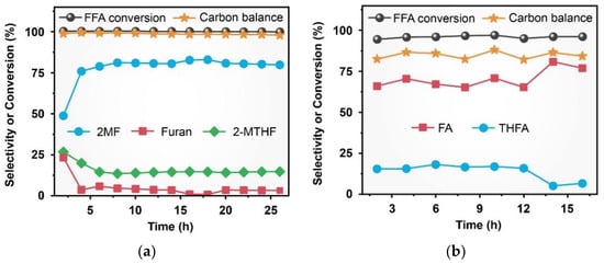 The earliest production of 2-MF was through the oxidation of 1,3-pentadiene from fossils, which is undesirable from a green chemistry perspective []. Therefore, the production of green chemicals from biomass conversion has received great attention, which not only limits the mitigation of fossil resources, but effectively utilizes the abundant biomass resources. 2-MF could be obtained from FFA by vapor-phase and liquid-phase hydrogenation []. For the liquid-phase method, Pd-, Pt-, Cu-, and/or Ni-based catalysts are commonly used [,,], which have been limited in their industrial applications due to a low yield of 2-MF and difficult separation []. Therefore, vapor-phase hydrogenation has received great attention.