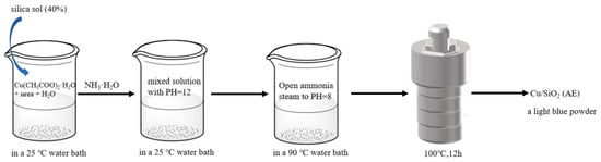 For the preparation of Cu/SiO2 catalyst by ammonia evaporation method (Figure 9), 5 g Cu(CH3COO)2·H2O, 2 g of urea and 200 mL H2O were dissolved and put in a 25 °C water bath. To the mixed solution, 10 g of silica sol (40%) was added and constantly stirred. Then, 10 mL of ammonia water was used to obtain pH = 12. After stirring at 25 °C for 1 h, the temperature was raised to 90 °C and stirred for 1 h. The ammonia was steamed openly to PH = 8, and the solution was a light blue turbid liquid. The solution was transferred to the hydrothermal reactor and kept at 100 °C for 12 h. The sample was filtered, washed, and dried. The sample was ground and calcined in flowing air at 450 °C for 4 h to obtain a light blue powder, which was denoted as Cu/SiO2 (AE), with the same metal loading as Cu/SiO2 (CP).