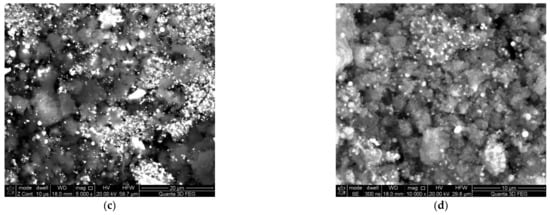SEM images of the catalyst surface used. (a) catalyst granule, (b) 1000-fold magnification, (c) 5000-fold magnification, (d) 10,000-fold magnification.