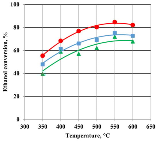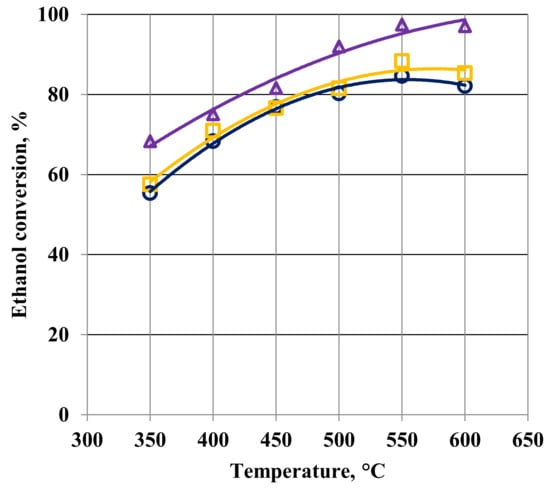 The metal cobalt catalyst was active from 350 °C. The activity of the catalyst increased rapidly when the temperature increased up to 500 °C (Figure 5 and Figure 6). The further increase in temperature had little effect on the ethanol conversion. Similar changes in the activity of various cobalt catalysts were observed by Y. Li et al. [13].