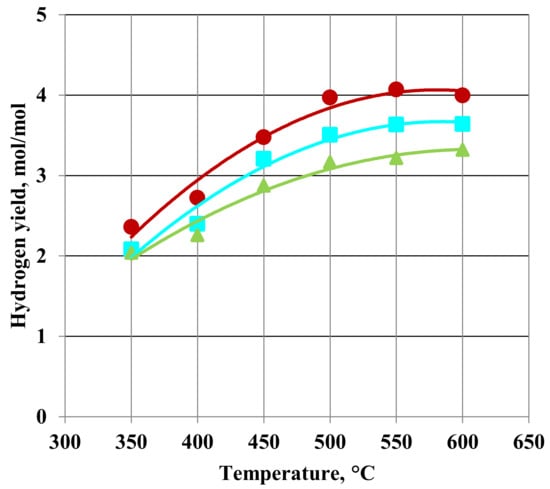Figure 7 and Figure 8 show the effect of temperature, feed flow rate, and feed stream composition on the hydrogen yield. The hydrogen yield increased with increasing the temperature, but already at 500 °C, it reached a high value. The increase in temperature to 600 °C had little effect on the hydrogen yield. The hydrogen yield decreased with increasing the feed flow rate. In contrast, the increase in the molar ratio of water to ethanol increased the hydrogen yield. The highest hydrogen production efficiency was 4.9 for high temperatures, the lowest flow, and the highest molar ratio of water to ethanol. Q. Shen et al. [31] also reported that the highest hydrogen yield was achieved at a high temperature and a high molar ratio of water to ethanol. The highest hydrogen yield was ~4.8 and was achieved for a higher molar ratio of water to ethanol compared to that used in this work.