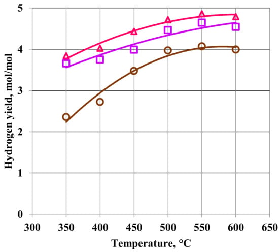 The influence of temperature and feed flow composition on the hydrogen yield. Feed flow rate = 0.4 mol/h. Water to ethanol molar ratio in the feed: Δ = 5, ▯ = 4, and ο = 3.