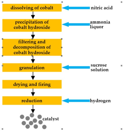 The obtained cobalt oxide was wetly granulated in a disk granulator using a 20% sucrose solution as a granulating liquid. Next, the 0.8–2 mm fraction was separated on the sieves. The granules were dried for 24 h. Then, the granules were fired at 1250 °C for 5 h. After cooling down the granules, the 0.8–2 mm fraction was separated and reduced with hydrogen at a temperature of 300 °C for 6 h.