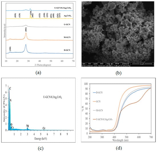 Characterization of GCN and GCN-based nanocomposites: (a) XRD, (b) SEM for U-GCN/0.3Ag2CrO4, (c) EDS, and (d) DRS.