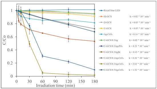 The photocatalytic degradation of 4-CP using GCNs and GCN-based nanocomposites with royal blue LED irradiation is summarized in Figure 2. The concentration of 4-CP decreased along with irradiation time in the presence of GCNs or GCN-based nanocomposites. Royal blue LED irradiation only did not cause the direct photolysis of 4-CP, as 4-CP does not have significant light absorption in these wavelengths. The 60-minute adsorption experiments showed that 4-CP did not adsorb on the surface of GCN or GCN-based nanocomposites (Figure S8). Therefore, the decrease of 4-CP concentration in this study is due to the photocatalytic reaction initiated by the GCN or GCN composites activated by royal blue LED irradiation. The bandgap energy for the three pristine GCNs (U-GCN, D-GCN, and M-GCN) varied from 2.68–2.75 eV, which corresponds to 462–450 nm. The royal blue LED has its maximum emission at 450 nm, with a full width at half maximum equal to 20 nm. Most photons emitted from the investigated royal blue LED have higher energy than the bandgap of the GCNs, which can be absorbed by the GCNs, leading to the photocatalytic degradation of 4-CP. Among the pristine GCNs, the highest 4-CP degradation rate (0.05 × 10−2 min−1) was observed with U-GCN. U-GCN has been reported to have better performance than D-GCN and M-GCN in hydrogen production from water, nitrogen oxide (NO) removal in the gas phase, and dye removal in an aqueous medium due to its high surface area, large pore volume, and large pore size [,,].