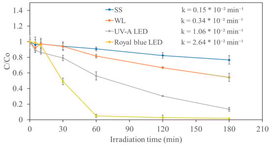 The results indicate that U-GCN/0.3Ag2CrO4, as a visible photocatalyst, can degrade organic contaminants under various lighting conditions. All evaluated photoreactors can emit photons with an energy larger than the bandgap of U-GCN, Ag2CrO4, and U-GCN/0.3Ag2CrO4 nanocomposite, and, therefore, can activate the photocatalyst to cause a series of photocatalytic reactions. The rate constants estimated for the solar simulator, cool white lamp, UV-A LED, and royal blue LED are 0.15 × 10−2 min−1, 0.34 × 10−2 min−1, 1.06 × 10−2 min−1, and 2.64 × 10−2 min−1, respectively. The royal blue LED had the highest k value of 2.64 × 10−2 min−1, which is 2.5 times that of UV-A LED, 7.8 times that of the cool white lamp, and 17.6 times that of the solar simulator. This high k value from royal blue LED is due to its very high light intensity.