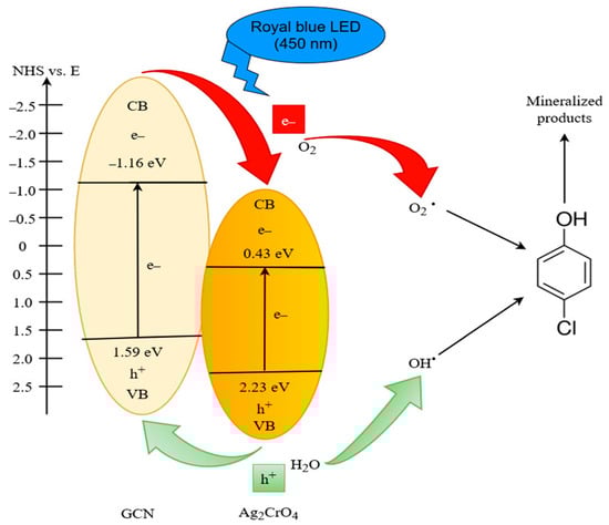 In Figure 4, there is an excitation of electrons on the U-GCN and Ag2CrO4 upon irradiation from a visible-light source and the electrons move from their respective VB to CB. Due to potential differences, electrons migrate from the CB of GCN, and it is accepted on the CB of Ag2CrO4, where the Ag+ is reduced to Ag0, while holes in the VB of GCN move to the VB of Ag2CrO4 [,,], leading to efficient charge separation. Subsequently, the accepted electrons by Ag2CrO4 react with the dissolved oxygen in the aqueous medium to produce superoxide radicals, while the holes on the surface of the GCN react with water molecules to produce hydroxyl radicals. The trapping of electrons and holes by the dissolved oxygen and water molecules will serve to limit the recombination, causing the formation of reactive oxidative species (O2• and OH•) that will lead to the complete mineralization of 4-CP, producing CO2, H2O, and HCl.