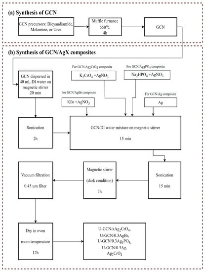 GCN/silver-based compound composites were synthesized by a dark-induced, in-situ deposition method (see Figure 5b) [,]. A total of 1 g U-GCN was dispersed in 40 mL of deionized water, stirred on a magnetic stirrer for 20 min, and then placed in an ultrasonicator for 2 h. After that, the solution was placed on the magnetic stirrer and different amounts of K2CrO4, KBr, Na2HPO4, Ag, and AgNO3 were added as follows: for U-GCN/0.3Ag2CrO4 composites, 0.2774 g AgNO3 and 40 mL K2CrO4 solution (4.83 g/L) were added; for U-GCN/0.3AgBr, 0.277 g AgNO3 and 40 mL KBr solution (4.85 g/L) were added; and for U-GCN/0.3Ag3PO4, 0.1386 g of AgNO3 and 40 mL Na2HPO4 (2.42 g/L) were added, while for U-GCN/0.3Ag, 0.3 g of Ag nanoparticle was added. The mixture of GCN/silver compounds was placed on the magnetic stirrer for 15 min and then transferred to the ultrasonicator for another 15 min. The solution was then placed on the magnetic stirrer in the dark for 7 h. The product was vacuum filtered using a 0.45 μm (nitrocellulose, Merck Millipore Ltd., Cork, Ireland), then washed with both DI water and ethanol at least five times. Finally, U-GCN/silver-based compound composites were obtained after drying in the oven (637 G, Fisher Scientific, Waltham, MA, USA) at room temperature for 12 h. Nanocomposites of U-GCN/Ag2CrO4 with different mass ratios of Ag2CrO4 denoted as U-GCN-xAg2CrO4, where x = 0.1, 0.3, and 0.5, were synthesized using the same procedure above with different masses of AgNO3 and K2CrO4. Ag2CrO4 was synthesized following a similar procedure in Figure 5b above, but without U-GCN. Described briefly, 0.2774 g AgNO3 was added to 0.1934 g of K2CrO4 40 mL solution, stirred for 20 min, sonicated for 2 h, stirred and sonicated for 15 min, and then stirred for 7 h in the dark. The product was vacuum filtered and washed with ethanol and water, then dried in the oven at room temperature for 12 h to obtain the Ag2CrO4 product.