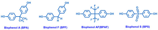 Chemical structures of Bisphenol A (BPA), Bisphenol F (BPF), Bisphenol AF (BPAF) and Bisphenol S (BPS).