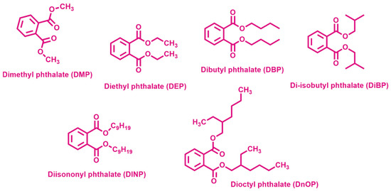 BPA is considered an EDC which negatively affects the environment when it is released in water or atmosphere [57] and human health when it enters the body, being able to interfere with the endocrine system, thus possibly causing reproductive and developmental disorders and diseases of the immune and nervous systems [58]. BPA is widely present in the aquatic environment, because it is used in the production of polycarbonate, epoxy resin and exploited in many plastic products, such as milk packaging and beverage cans in the food industry [59]. Considering human health, the United States Environmental Protection Agency (US EPA) strongly recommended a reference limit dose for oral exposure of 50 μg BPA/kg of body weight/day in 2014 [60]. In view of the above, the removal of BPA from wastewater is a critical issue at present. Phthalic acid esters (PAEs), or phthalates, are typical EDCs and a chemical class of plasticizers used in many plastic products. The ubiquitous presence of PAEs makes them detected everywhere as result of release to water, atmosphere and soil [61]. The scientific community agrees on the role of anthropogenic activities as the primary contributor to the occurrence of bisphenols and phthalate monoesters in lakes, lagoons, and their sediments, caused by the discharge of domestic and industrial waste and wastewater, as well as farming, transportation, etc. [62,63]. The major species detected between the phthalates in the influents of wastewater treatment plants are dimethyl phthalate (DMP), diethyl phthalate (DEP), dibutyl phthalate (DBP) (Figure 3).