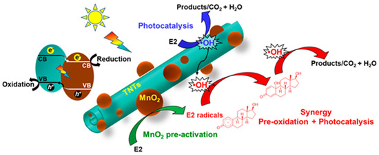 - Du, P.; Chang, J.; Zhao, H.; Liu, W.; Dang, C.; Tong, M.; Ni, J.; Zhang, B. Sea-Buckthorn-Like MnO2 Decorated Titanate Nanotubes with Oxidation Property and Photocatalytic Activity for Enhanced Degradation of 17β-Estradiol under Solar Light. ACS Appl. Energy Mater. 2018, 1, 2123–2133. [Google Scholar] [CrossRef]