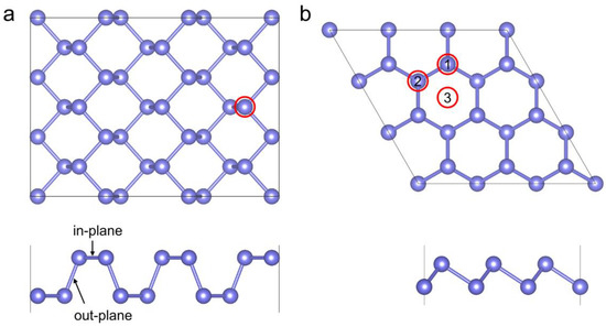 Atomic configurations of all group-VA 2D monolayers. (a) α and (b) β phase. Red circles represent the different adsorption sites for Cl atoms. Top panel—top view; bottom panel—side view.