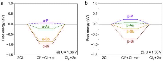 The electrocatalytic CER is a two-electron process through the Volmer-Heyrovsky mechanism [12,34]. By using the Cl* intermediate, this mechanism can be explained by that Cl* forms first via the adsorption and discharge of a chloride anion in the Volmer step (* + 2Cl− → Cl* + Cl− + e−). Thereafter, the Cl* intermediate directly combines with another chloride anion from the electrolyte solution to release gaseous chlorine in the Heyrovsky step (Cl* + Cl− + e− → * + Cl2 + 2e−). Figure 2 depicts the Gibbs free energy changes for CER with the most stable configurations of all monolayers with α and β phases at the equilibrium potential of 1.36 V according to Volmer and Heyrovsky steps. The theoretical overpotential for CER (ηCER) can be defined by the ΔGCl*, namely ηCER = |ΔGCl*|/e. As shown in Figure 2, the interactions between Cl atoms and α-monolayers are relatively stronger than that of β-monolayers due to the much more negative values of ΔGCl*. In the case of α-monolayers, the energy wells of α-arsenene, α-antimonene, and α-bismuthene indicate that the Cl* can form spontaneously. However, the interactions between As, Sb, and Bi and Cl atoms are too strong for efficient Cl2 desorption. Consequently, the formation of Cl2 in the Heyrovsky step is energy-demanding for α-arsenene, α-antimonene, and α-bismuthene with the thermodynamic overpotentials of −0.232 V, −0.856 V, and −0.966 V, respectively. As a comparison, the small energy barrier for α-phosphorene implies that the formation of Cl* in the Volmer step is more energy-demanding, leading to a theoretical overpotential of 0.055 V. It demonstrates that the CER mechanisms on α-group VA monolayers can be adjusted by using different elements, and α-phosphorene possesses the highest activity for Cl2 evolution among these materials.