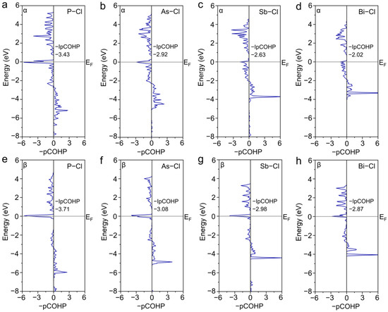 COHP analyses of the chemical bonding between the adsorbed chlorine and group-VA element for (a) α-phosphorene; (b) α-arsenene; (c) α-antimonene; (d) α-bismuthene; (e) β-phosphorene; (f) β-arsenene; (g) β-antimonene; and (h) β-bismuthene monolayers, with the adsorbed Cl atom. The bonding and antibonding states are positive and negative of −pCOHP, respectively. The corresponding integral of −pCOHP (−IpCOHP) values are also provided.