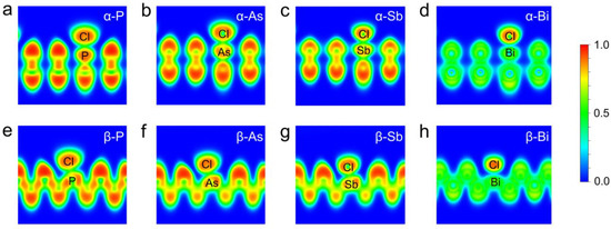 The electron localization functions for (a) α-phosphorene; (b) α-arsenene; (c) α-antimonene; (d) α-bismuthene; (e) β-phosphorene; (f) β-arsenene; (g) β-antimonene; and (h) β-bismuthene monolayers with the adsorbed Cl atom.