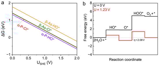 (a) The adsorption free energy for Cl* and HO* on α-phosphorene and β-arsenene monolayers as a function of the theoretical standard hydrogen electrode potential (USHE) at pH = 0; (b) Gibbs free energy diagram for OER on β-arsenene monolayer.