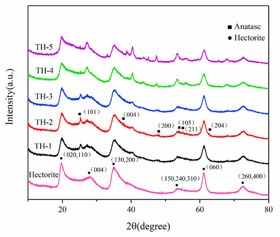 Figure 1 shows the XRD patterns of hectorite and TiO2/hectorite (TH-1, TH-2, TH-3, TH-4, and TH-5). As for the hectorite, characteristic diffraction peaks of 2θ approximately appear at 19.6, 28.0, 35.1, 53.3, 61.0, and 72.3° [20,21]. It can be observed that hectorite has low crystallinity and small particle size from the widened peaks. Some weak peaks of 2θ appear at 29.0, 32.0, 38.7, 48.9, and 54.7°, which may be attributed to the residual starting materials and some intermediate products, such as lithium fluoride, lithium, and silicate [10].