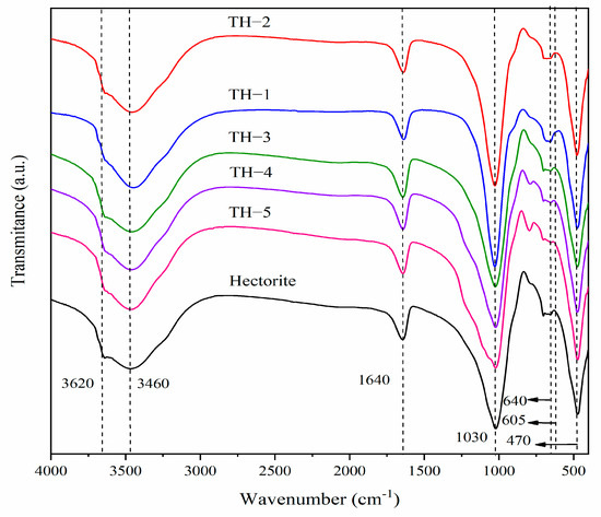 FTIR spectra for hectorite, TH-1, TH-2, TH-3, TH-4, and TH-5.