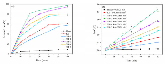 where the K constant is the shape factor (value as 0.89), λ is the wavelength, and β is the half-peak width of the signal. The crystallite sizes of TiO2 in TH-1, TH-2, TH-3, TH-4, and TH-5 are 11.3, 10.8, 11.2, 11.4, and 11.9 nm, respectively, according to the (101) peak by Equation (1), which are all smaller than that of P25 (21 nm) (Table 1). The appropriate particle size of TiO2 is beneficial to increase the surface area, providing more photocatalytic active sites to improve the photocatalytic efficiency.