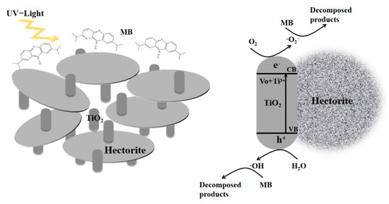 Based on the above result, the photocatalytic mechanism of TH-2 is given in Figure 9. First, TiO2 in the interlayer of hectorite can increase the specific surface area to increase the adsorption capacity and contact of MB and the photocatalyst. Secondly, TiO2 is uniformly dispersed on the hectorite to provide more active sites for the reaction. Thirdly, it is the most important that during the photocatalytic process, the electrons are stimulated from the valence band to the oxygen vacancy and Ti3+ in TiO2 under UV light irradiation, and the oxygen vacancy defect is beneficial to the adsorption of O2, while the positive charge holes are left in the conduction band. At the same time, the negatively charged interlayer surface of hectorite is conducive to improving the photocatalytic activity, and the photogenerated holes can migrate to the surface quickly under the electronic attraction on the negatively charged interlayer surface.