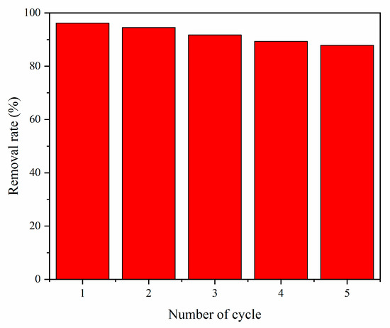 Stability and reutilization are important to industrial application [47,48]. The reusability of the TH-2 composite is exhibited in Figure 10. After 5 cycles, the results show that the photoactivity can still achieve 87.9%, indicating the outstanding stability of TH-2. The decrease in catalytic activity may be mainly caused by the loss of surface area and the deposition of byproducts at the surface of the photocatalyst. It can result in the loss of active sites, agglomeration of nanoparticles, and reduction in crystallinity, which has been suggested by previous studies [49,50].