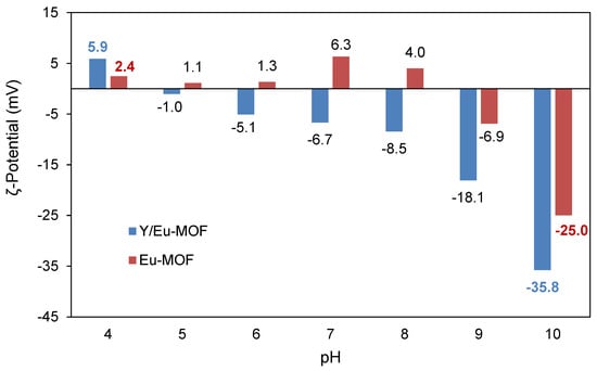 ζ-potential is one of the fundamental parameters normally used to measure the magnitude of the electrostatic (or charge) repulsion or attraction between particles, being an indirect estimate of the surface charge density of the systems and helping to determine the repulsive interactions between colloidal particles, as well as the tendency of aggregation. Systems with high ζ-potential (/+) are considered electrically stable, whereas colloids with low ζ-potential (/+) are usually referred to as systems that tend to aggregate and further precipitate. In this study, measurements were always conducted at a fixed conductivity of 330 µS/cm, which is equivalent to a concentration of about 3.7 mM NaCl (Figure S7). The highest negative value of the ζ-potential, obtained with Y/Eu-MOF, was reached at pH 10 (−35.8 ± 0.5 mV, electrophoretic mobility of −2.252 ± 0.035 µmcm/Vs), suggesting that: (i) the dissociation of external acidic groups have occurred, conferring the overall negative charge (Figures S8 and S9, Table S7); (ii) the MOF particles will tend to repel each other, and there will be no tendency for the particles to come together at this basic pH, due to this large value of ζ-potential. However, when reducing the pH of the solutions, the ζ-potentials values started to increase, evidencing an isoelectric point between pH 4 and 5. Similar results were previously reported by our group. The Eu-MOF catalyst, with the highest negative value of ζ-potential, was also obtained at pH 10 (−25.0 ± 0.6 mV); however, in this case, the isoelectric point was obtained between pH 8 and 9 (Figure 2). From an electrophoretic behavior point of view, the mixed nature of MOF confers both a higher stability, as a function of pH, and less tendency to aggregate.
