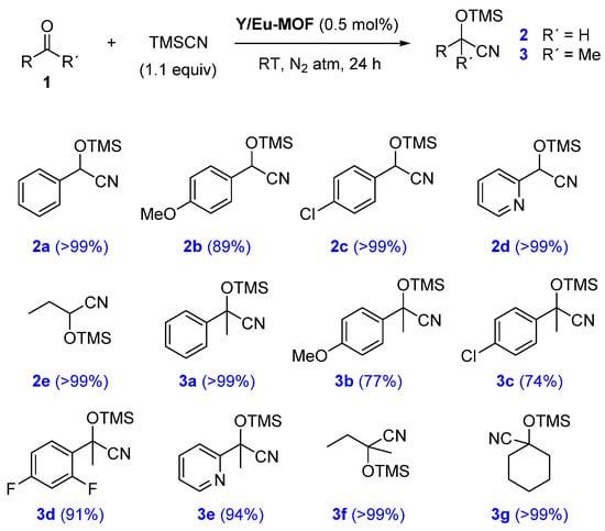 General procedure for the cyanosilylation reaction: In a 1 mL vial, with a septum screw capped, equipped with a stirring bar, Y/Eu-MOF catalyst (0.5 mol%) was weighed. Subsequently, the corresponding amount of carbonylic compound 1 (0.25 mmol) was added, followed by trimethylsilyl cyanide (TMSCN) (34 μL, 0.275 mmol, 1.1 equiv.), and the reaction was stirred under inert N2 atmosphere at room temperature for 24 h. Once the reaction was finished, the catalyst was removed by centrifugation (12,300 rpm, 5 min) and washed with DCM (2 × 0.5 mL), obtaining the corresponding pure products 2 and 3, after removal of the solvent with rotary evaporator. When not full conversion was reached, the product was purified by column chromatography using hexane as eluent.