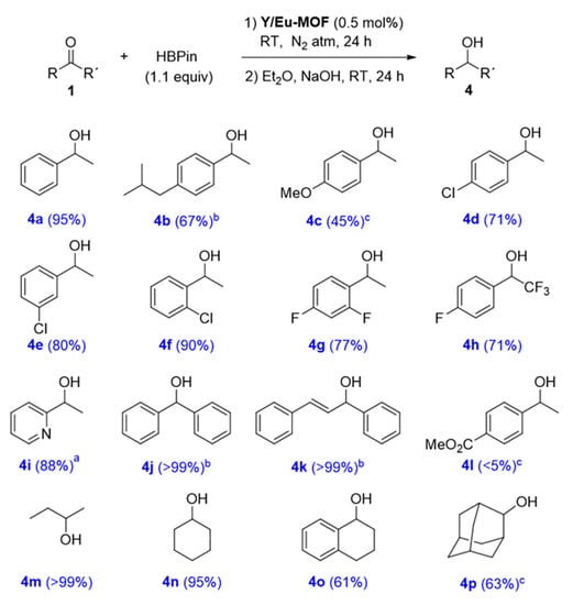 General procedure for the hydroboration reaction: In a 1 mL vial, with a septum screw capped, equipped with a stirring bar, Y/Eu-MOF catalyst (0.5 mol%) was weighed. Subsequently, the corresponding amount of carbonylic compound 1 (0.25 mmol) was added, followed by pinacolborane (HBpin) (40 μL, 0.275 mmol, 1.1 equiv.), and the reaction was stirred under inert N2 atmosphere at room temperature for the corresponding time, as indicated on the table. After that time, the hydrolysis of the final product was carried out adding NaOH (0.1 M, 0.5 mL) and Et2O (0.5 mL), and the mixture was stirred overnight. Once the reaction was finished, the catalyst was removed by centrifugation (12,300 rpm, 5 min) and washed with DCM (2 × 0.5 mL), obtaining the corresponding product 4 after removal of the solvent with rotary evaporator. When not full conversion was reached the product was purified by column chromatography.