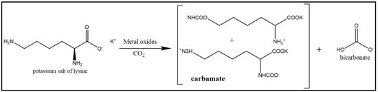 Adding metal oxides to an amino acid, such as lysine, for CO2 capturing is a promising process. Some groups had studied the catalytic effect of metal oxides on the salts of amino acids, which have many advantages that make them suitable alternative absorbers for carbon dioxide [] Some of these advantages are their high cyclic loading and good oxygen stability. It also allows the salt formation in potassium or lithium hydroxide, which makes the amino acid salt non-volatile in a stripper. The metal oxide catalytic activity depends on the defect sites present on the metal oxide surface [] This metal oxide surface is exposed to water, which generates metallic hydroxides, suggesting that the metal oxides can enhance the carbon dioxide absorption kinetics of the lysine salt absorbent liquid, as shown in Figure 3.