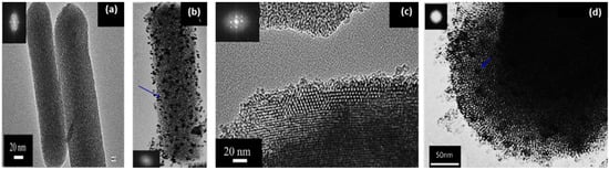 TEM of images: (a) mesoporous silica (rod shape), (b) mesoporous silica rod -Cu (NPs), (c) mesoporous silica (spherical shape), and (d) mesoporous silica spherical-Cu (NPs) and the insets show the electron diffraction pattern (Adapted with permission from Ref. []. Copyright 2018 Elsevier).