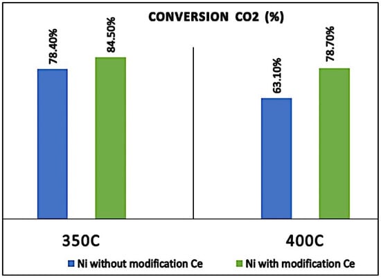 Among the metals, nickel is a promising metal due to its high activity and the fact that it is relatively cheaper than noble metals. However, Ni-based catalysts tend to be deactivated during the methanation reaction due to coke formation and sintering of Ni particles at high temperatures []. It has been suggested that the addition of ceria can enhance the catalyst performance and coke resistance; therefore, as shown in Figure 5, Ceria (CeO2) can work as a structural and electronic promoter in order to promote the dispersion of Ni on the support and change the properties of Ni via metal-support interactions, due to the oxygen vacancies of ceria [], where it acts as a structure promoter to improve the dispersion of Ni species on the supporter, as well as electron promoter to accelerate []. For the samples without Ce modification [], the results show that the CO2 conversion rate using Ni/RGO was 63.1% at 400 °C and 78.4% at 350 °C, respectively, while, with Ce modification, the CO2 conversion increased, compared to the samples without Ce. Both the experimental and theoretical investigations confirm that the excellent catalytic performance of Ni–Ce/RGO reaches the highest activity at 350 °C, with a CO2 conversion of 84.5% and 78.7% (400 °C) [].