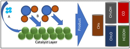 Electrocatalysis can be defined as the catalytic processes of redox reactions that directly transfer electrons []. The electrolysis of carbon dioxide has attracted wide attention due to the moderate operating conditions, where the reaction rate and requirements of the reaction process can be controlled, and the use of simple equipment and energy; additionally, the catalyst is recyclable []. Electrical stimulation generally occurs when an electron is transferred from cathode to anode. A membrane is placed in between to prevent mixing, and a salt bridge is placed to maintain electroneutrality [].