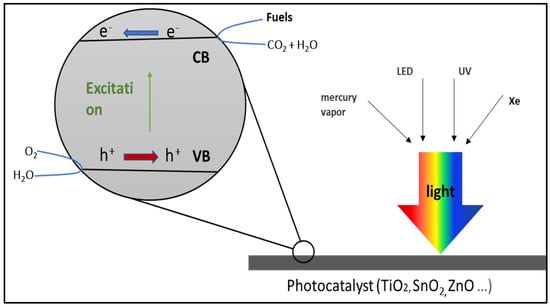 TiO2-based catalysts are a standard for studying photocatalysis due to their simple preparation, low cost, and high stability. However, TiO2-based catalysts still do not effectively absorb visible light due to the large bandgap, making it of minor importance for solar energy harvesting [,]. Figure 9 shows that TiO2 acts as a photocatalyst under light radiation, where the incident photons are absorbed with energy higher or equal to that of the bandgap conductor. Then, the pair charges, electrons, and holes are generated, reducing the carbon dioxide into value-added products [].