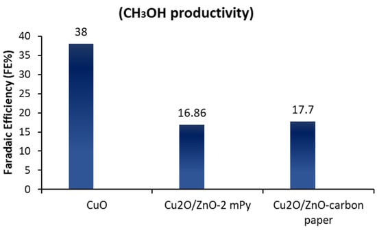 However, CRR electrocatalysts are subject to many obstacles, such as high production cost, high activation barrier (or excessive overvoltage), and poor control of product selectivity []. Currently, the copper oxide electrodes are characterized by high faradaic efficiencies of methanol, in a study conducted by M. Le Group to examine the composition and behaviour of methanol using multiple electrical catalysts with surface sites []. It was found that the types of copper oxides have a significant role in raising the efficiency of faradaic, as the electrodeposited cuprous oxide electrodes were higher than the copper oxide by air with a faradaic efficiency of (38%), as shown in Figure 10, for methanol production using catalysts based on CuO, Cu2O/ZnO2 mPy [], and Cu2O/ZnO []. Through these studies, the researchers developed modified nanoparticles of graphene oxide reduced carbon with a heterocyclic compound containing an N ring and imidazole, known as (NB), with copper nanoparticles (CuNPs @ rGO-NB) [,]. RGO (rGO-NB) is widely used in electrical catalysis processes due to its high activity and selectivity and has long-term stability when used as a catalyst []. In comparison, nanoparticle symmetric copper electrodes are used to produce a mixture of hydrocarbon products [].