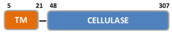Since DtCel5A contains a transmembrane helix to its N-terminal end, as predicted by TMPRED (Figure 1), we cloned the corresponding gene deprived of its first 19 amino acids. Additionally, we mutated two cysteine residues to their isosteric serine (Cys156Ser and Cys308Ser) to avoid aggregation phenomena in the solution. The recombinant protein was overexpressed for biochemical and structural studies.