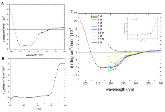 The thermal and chemical stability of cellulose-hydrolyzing enzymes are precious characteristics for their biotechnological use. Using far-UV CD spectroscopy, we observed that the spectrum of DtCel5A is typical of a well-structured α-β fold, indicating a good degree of structural integrity of the protein in the solution (Figure 2A). To investigate the heat-induced changes in the protein’s secondary structure, thermal unfolding curves were recorded by following the CD signal at 222 nm as a function of temperature, using a 1 °C/min heating rate. Thermal unfolding shows that DtCel5A is highly thermostable, with a melting temperature of 85 °C (Figure 2B).