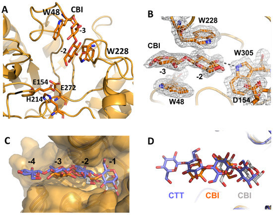 Crystals of complexes of DtCel5A with cellobiose, the major hydrolysis product of most endo-β-1,4-glucanases, were obtained in the P212121 space group. Indeed, likely due to the partial occlusion of the catalytic site pocket operated by the N-terminal region of DtCel5A in the P32 space group (Figure 4), all soaking and co-crystallization experiments were unsuccessful in these experimental conditions. The analysis of electron density maps shows a single cellobiose molecule located at the entrance of the DrCel5A catalytic pocket (Figure 6A,B). This cellobiose molecule is stacked between Trp48 and Trp228 and forms a hydrogen bond with the side chain of Trp305 (Figure 6B). Superposition of the apo-form and cellobiose-bound complex structures show that the binding of cellobiose to the enzyme does not cause significant conformational changes (rmsd on backbone atoms 0.7 Å).