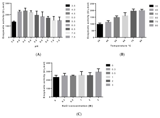 Functional characterization of DtCel5A. (A–C) panels show the effects of pH, temperature, and NaCl concentration on DtCel5A enzymatic activity, respectively.