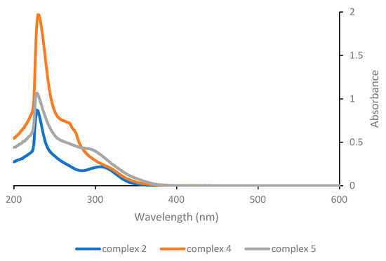 UV-Vis absorption spectra of complexes with general structure [Pt(γ-acac)(O,O′-acac)L] as 5 × 10−5 M solutions in dichloromethane.