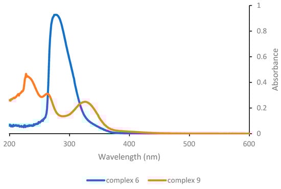 UV-Vis absorption spectra of complexes 6 and 9 as 5 × 10−5 M solutions in dichloromethane.