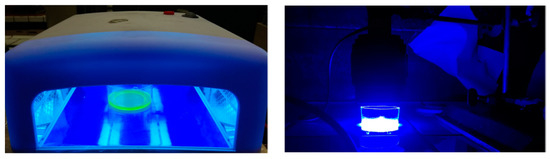 Two systems were employed for irradiation: a standard UV lamp for nail reconstruction featuring 4 × 9 W bulbs irradiating in the range 340–380 nm and a blue LED lamp irradiating at 455 nm with an output power at 1.4 W. Samples were placed at a fixed 2 cm or 3 cm distance from the light source, respectively (Figure 4). Tests were run at room temperature or, in the case of the tests in the dark, in an oven thermostated at 50 °C to speed up the process.