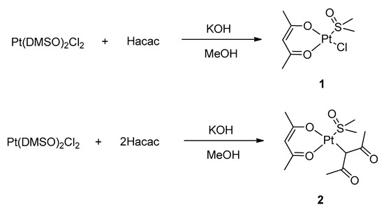 The synthetic route proved successful and allowed for the preparation of complexes 1 and 2, depending on the stoichiometric ratio between the acetylacetonate and the platinum precursor (see Supplementary Materials). In complex 2, the complete substitution of the chloride ligands of the precursor by acetylacetonate is achieved, although one acetylacetonate ligand coordinates as a O,O′-chelating bidentate ligand and the second one as a C-monodentate ligand through the γ carbon atom. Remarkably, simple Pt(acac)2 cannot be synthesized through this procedure.
