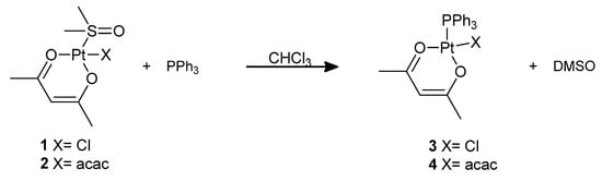 However, the DMSO ligand in complexes 1 and 2 can be substituted by softer ligands. We performed this substitution reaction at room temperature using triphenylphosphine as the incoming ligand, obtaining complexes 3 and 4 that were previously reported by De Pascali et al., (Scheme 2, see Supplementary Materials) [21]. The reaction can easily be followed by monitoring the NMR signals of coordinated and free DMSO in the 1H NMR spectrum of the compound. Incidentally, complex 4 can also be prepared upon nucleophilic attack by PPh3 on Pt(acac)2 [22].