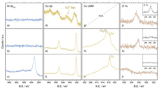 Directly after thermal evaporation, oxygen/carbon species and completely oxidized copper cover the sample surface. Copper is present as CuO, as indicated by the shifted, broader peak and shake-up satellite features (Cu2+ sat.) in Figure 1d. Ar+ sputter cleaning leads to partial sample reduction (Figure 1k). Therefore, the exclusion of Cu(I) oxide by the acquisition of Cu LMM Auger spectra is necessary since its peak is not shifted and only slightly broader than that of metallic copper (Figure 1e). The obtained Cu LMM Auger spectrum in Figure 1h shows evidence of Cu2O at a KE of 916.8 eV, apart from metallic copper at a KE of 918.6 eV, after a partial sample reduction. Thermal annealing ultimately achieved complete reduction, as no traces of oxidized species were detected spectroscopically. Until the last step, the corresponding Ni 2p3/2 region showed no nickel at all due to plenty of deposited copper on top of the Ni foil substrate, whereas after the full cleaning/thermal annealing process, a well-resolved metallic Ni peak arose (Figure 1c).
