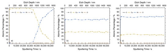 Determination of the surface and bulk catalyst composition by sputter depth profiling: XPS depth profiles of NiCu II (a) after thermal evaporation PVD of Cu, (b) followed by treatment in 10% H2/He atmosphere at 1000 °C for 30 min and (c) after Ar+ sputter cleaning, UHV annealing at 800 °C for 10 min and 2 cycles of temperature-programmed DRM reaction. An etch depth calibration of the sputtering time was conducted from tactile profilometer measurements, resulting in a conversion factor of 0.025 nm/s.