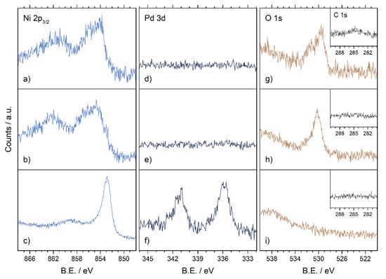 Ni 2p3/2, Cu 2p and O1s/C1s XP spectra of the cleaning process for NiPd I: (a,d,g) after thermal evaporation PVD of Pd and subsequent treatment in 10% H2/He atmosphere at 1200 °C for 30 min, (b,e,h) after by Ar+ sputter cleaning, and (c,f,i) after UHV annealing at 800 °C for 1 h.