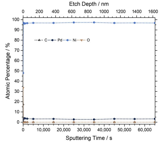 In addition, the depth profile of NiPd I was investigated after one DRM cycle (plotted in Figure 4) to determine the catalyst’s homogeneity compared to NiCu II (Figure 3c).