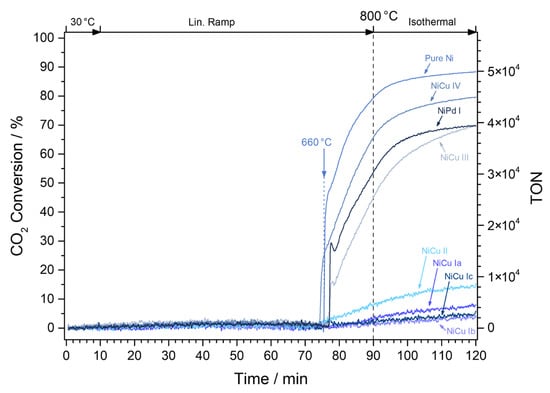 The group of the more active catalysts (pure Ni, NiCu IV and III, NiPd I in Figure 5) exhibited a sudden, stepwise onset of catalytic activity followed by rapid CO2 conversion. Onset temperatures range from 649 °C (NiCu IV) to 677 °C (NiCu III). This apparently autocatalytic self-activation process occurred for the pure Ni catalyst within the described temperature range at 660 °C, as highlighted in Figure 5, and for NiPd I at 676 °C, which is very similar to NiCu III. However, bimetallic NiCu catalysts with moderate or low activities (NiCu Ia-Ic, NiCu II) possess hardly any self-activation step. For these samples, the determination of the exact catalytic onset temperature is not straightforward and can only be estimated at around 630–650 °C, i.e., at clearly lower values as compared to the distinctly “self-activating” catalysts. The observed rapid onset indicates a fast modification process on the respective catalyst’s surfaces occurring at a specific temperature, which may depend not only on their bulk composition. We propose that this onset emerges most likely from the sudden breakdown of an inactive/passivating oxide layer that was most likely formed on the catalyst’s surface during exposure to the reaction mixture in the sub-onset temperature regime. This breakdown/self-activation phenomenon is currently investigated in more detail both by XPS analysis in the combined UHV/high-pressure catalysis setup (i.e., by stopping the catalytic runs before and after the step).